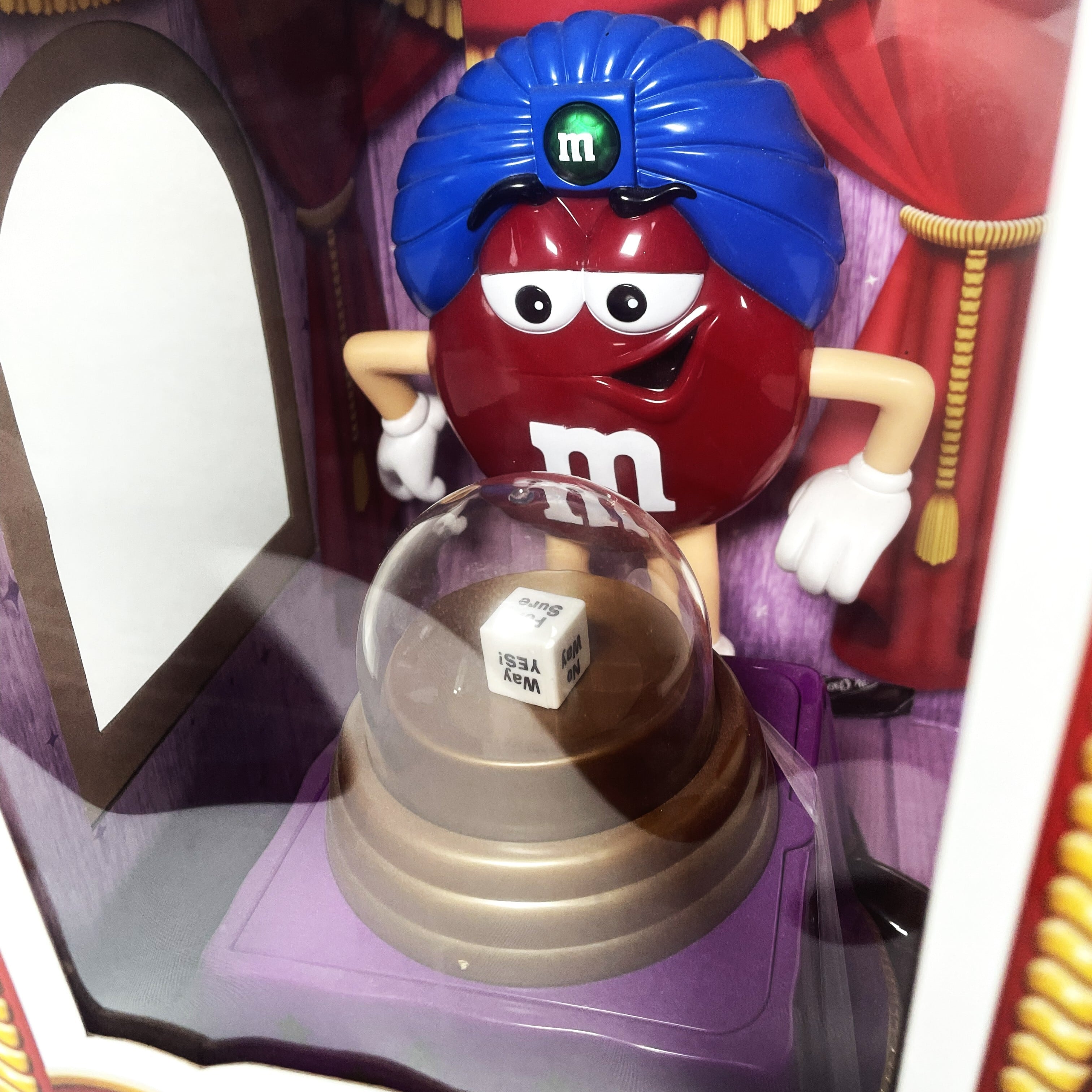 サイドの蓋の部分からチョコレートキャンディーを入れてクリスタルボールを押すと横からキャンディーが出てくる仕組みになっています。