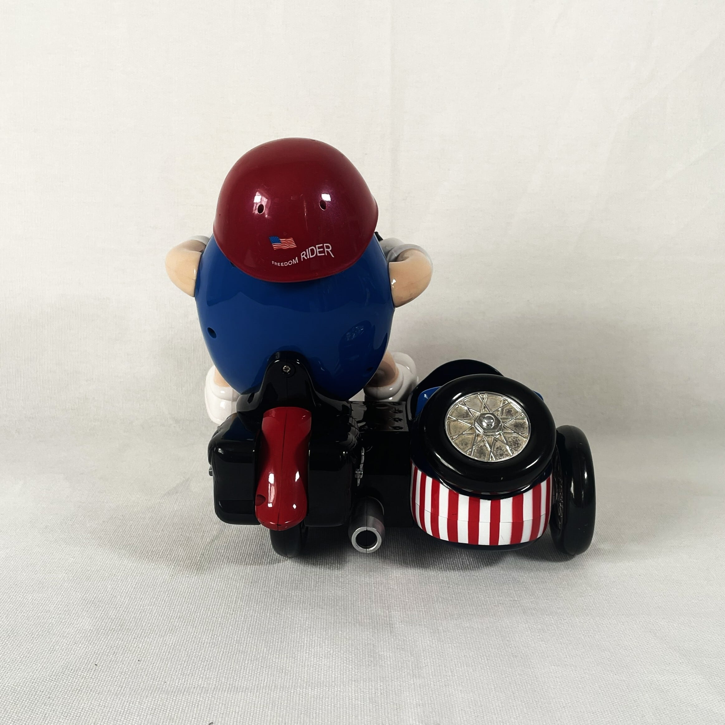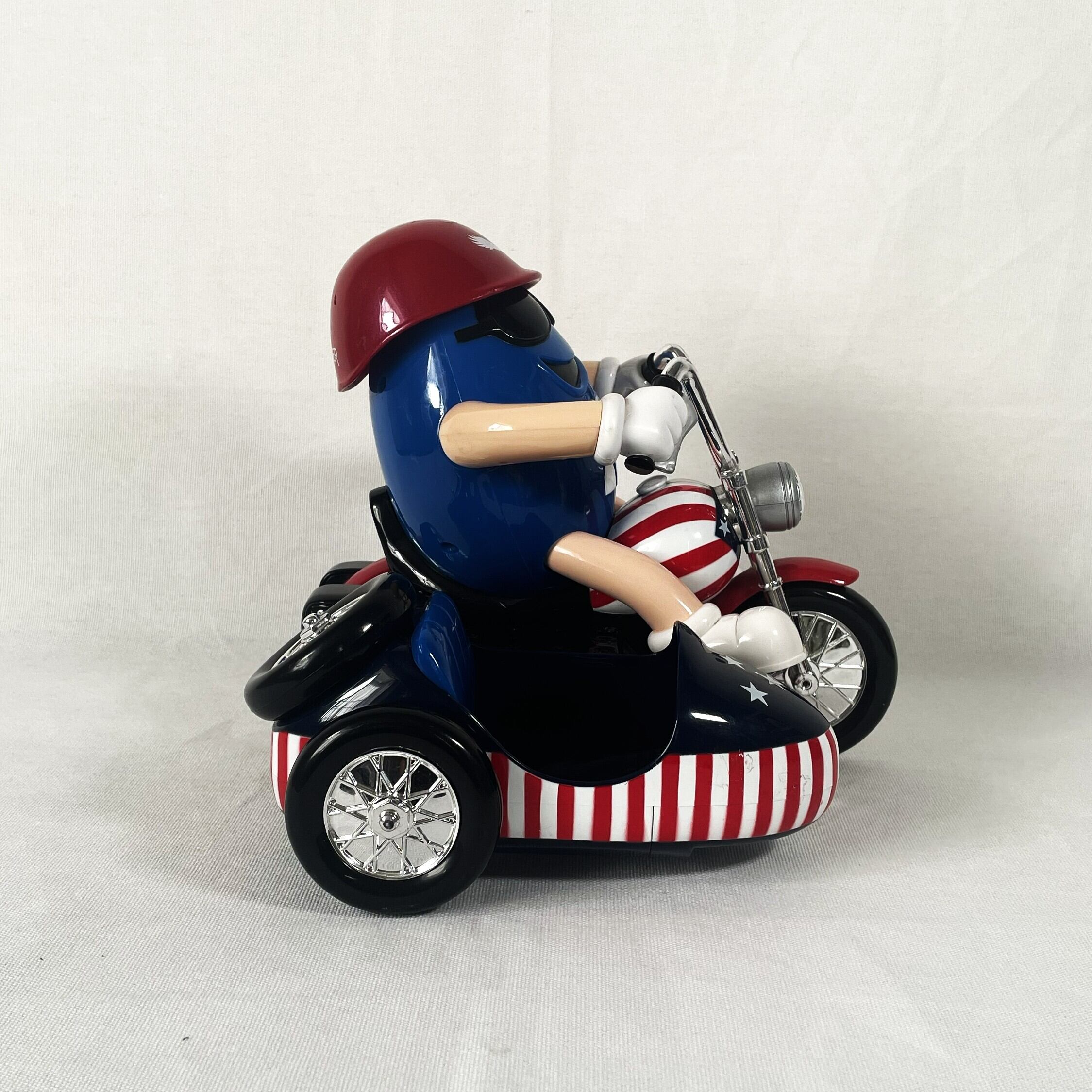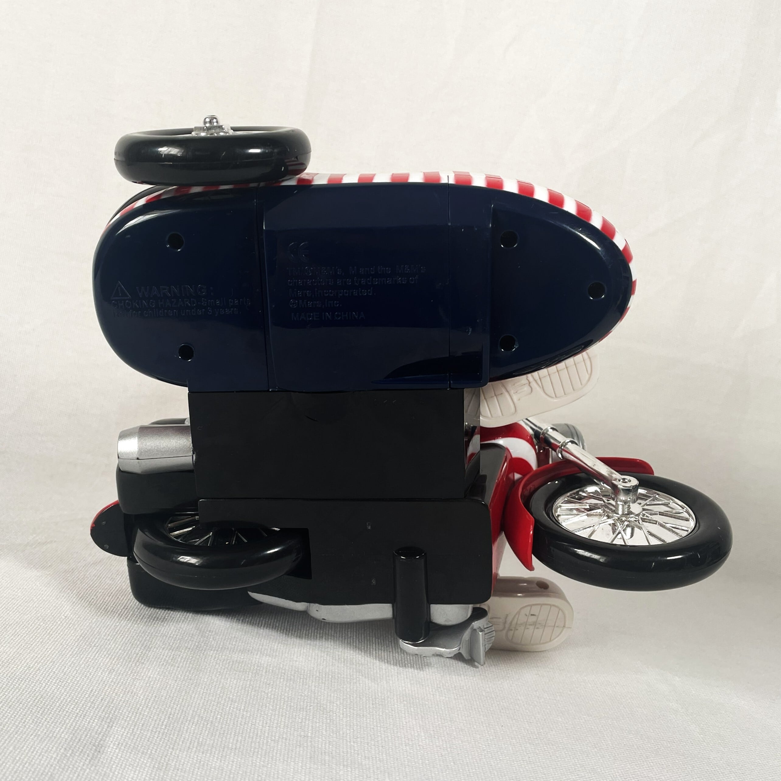 ブルーのヘルメットをとって頭からチョコレートを補充して左足を下げるとサイドカーからチョコレートが出てくる仕組みになっています。