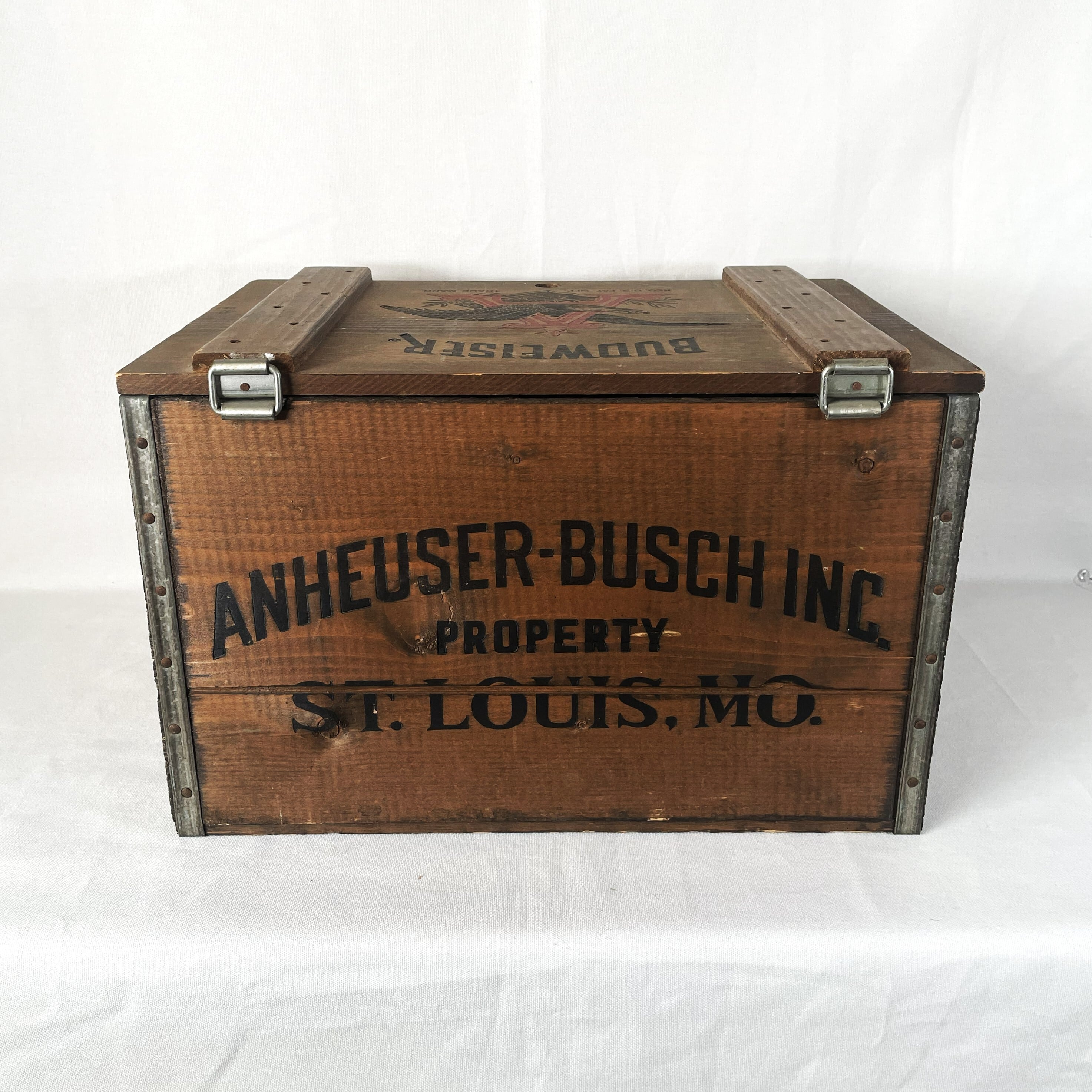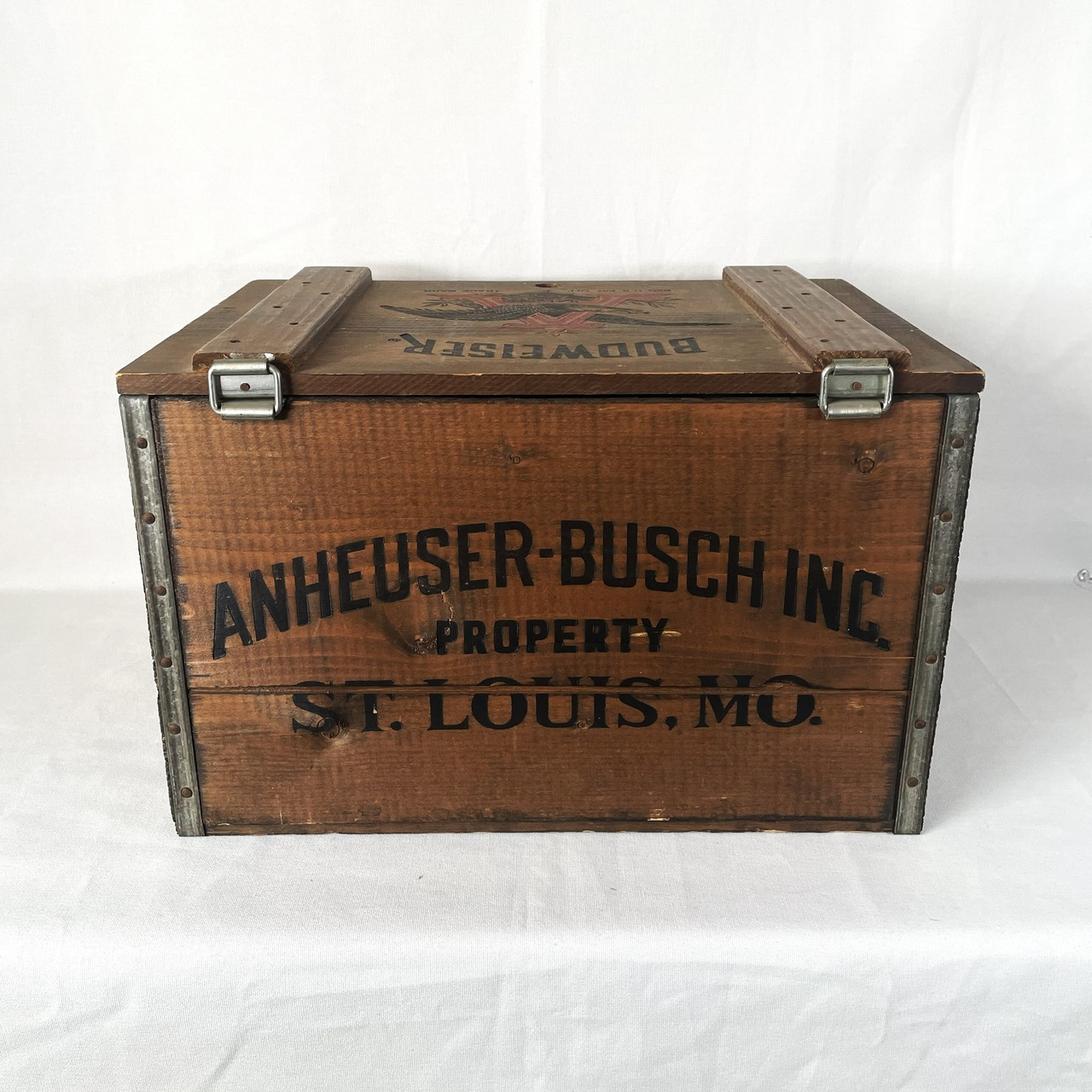 フロントにアンバイザーブッシュ社のアーチロゴが入っており創設100周年の記念に作られたクレートで蓋付きで非常に人気の高いアイテムです。